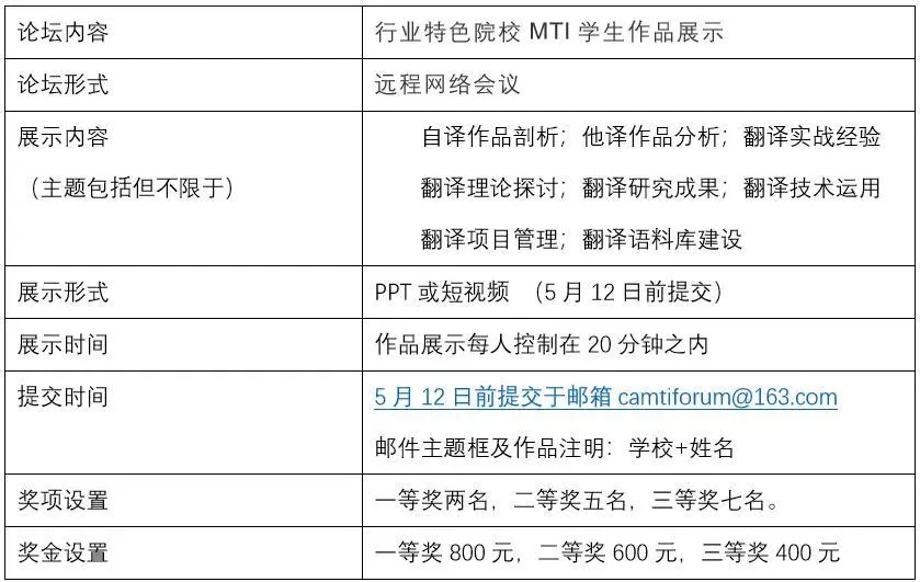 员工论坛诚邀各院校MTI员工分享翻译学习及实践中的各种成果。为鼓励员工积极参与,本次员工论坛将邀请专家对展示作品进行评奖,对优秀作品颁发奖金及证书。